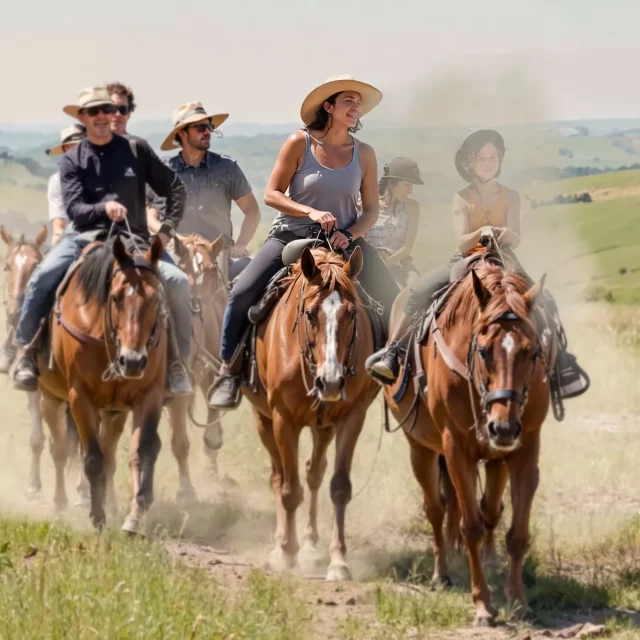 Geführte Pferdetouren durch die Natur. Dabei lernst Du, wie die Pferde für die Tour vorbereitet werden.